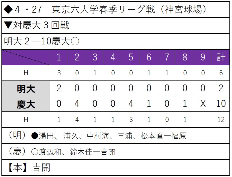初回に内海優太外野手(商4=広陵)の適時打で幸先よく先制するも、先発の湯田統真投手(政経3=仙台育英)が本塁打を浴びるなど1回1/3を投げて4失点。中継ぎ陣も強力な慶大打線を相手に崩れ、主導権を奪い返すことができず。勝ち点を献上した。