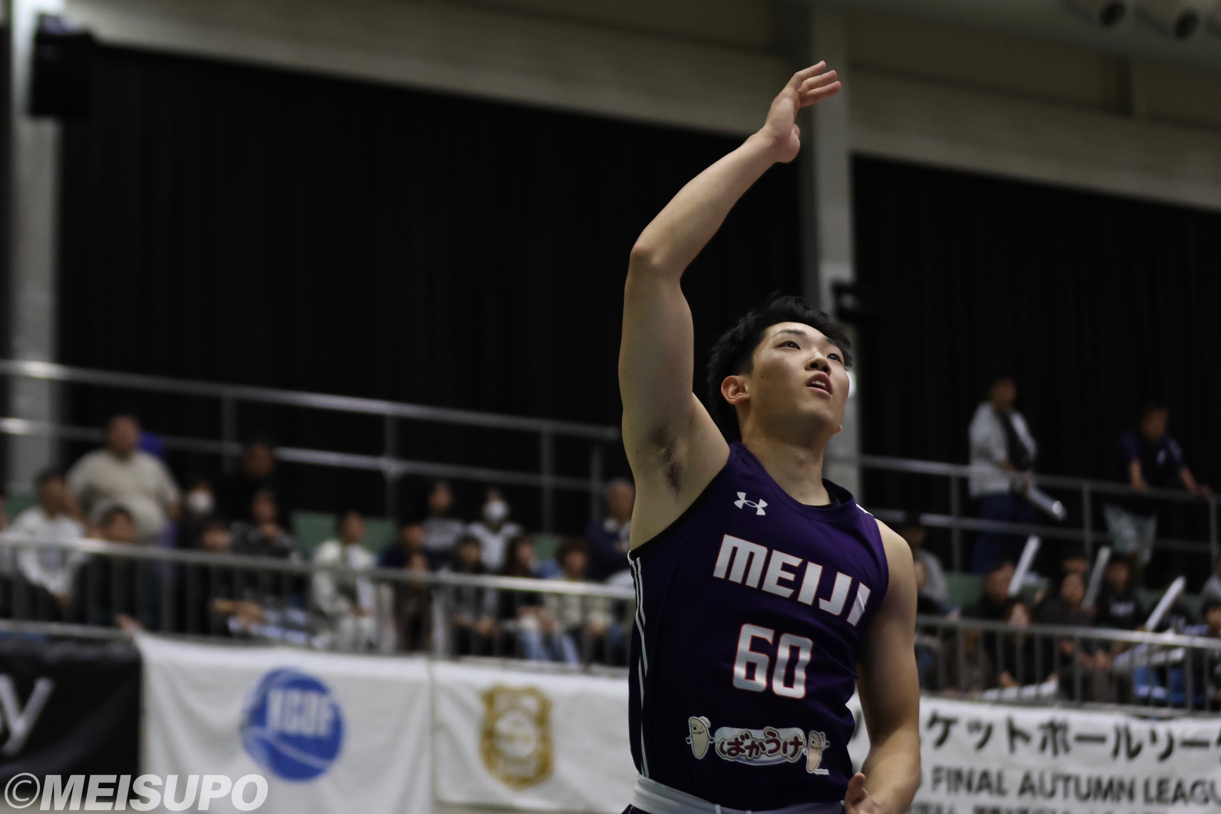 序盤から苦しい展開が続いた。最初の3分は膠着(こうちゃく)状態が続きスコアは6―6。しかし「相手のプレッシャーが強くシュートが安定しなかった」(S G吉村公汰・営4=土浦日大)と得点を奪えない時間が続き、焦りが見える。相手は強豪・白鷗大。ここで見せたスキを逃してはくれなかった。留学生にも苦戦した明大は、連続17失点を含む大量失点で大幅にリードを広げられ、20点差で第1Qを終えた。一度傾いた流れを引き戻すのは容易では無い。それ以降も反撃の糸口をつかむことができず、第3Q終了時点で39―71と勝利はかなり絶望的な状況となった。それでも、ここから意地を見せる。守備から自分たちのペースを作り、徐々に息の合った連携が増えていった。追い上げを見せ、第4Qのスコアは17―6と相手を上回る。最後に一矢報いることに成功するが、序盤の差が響き完敗となった。