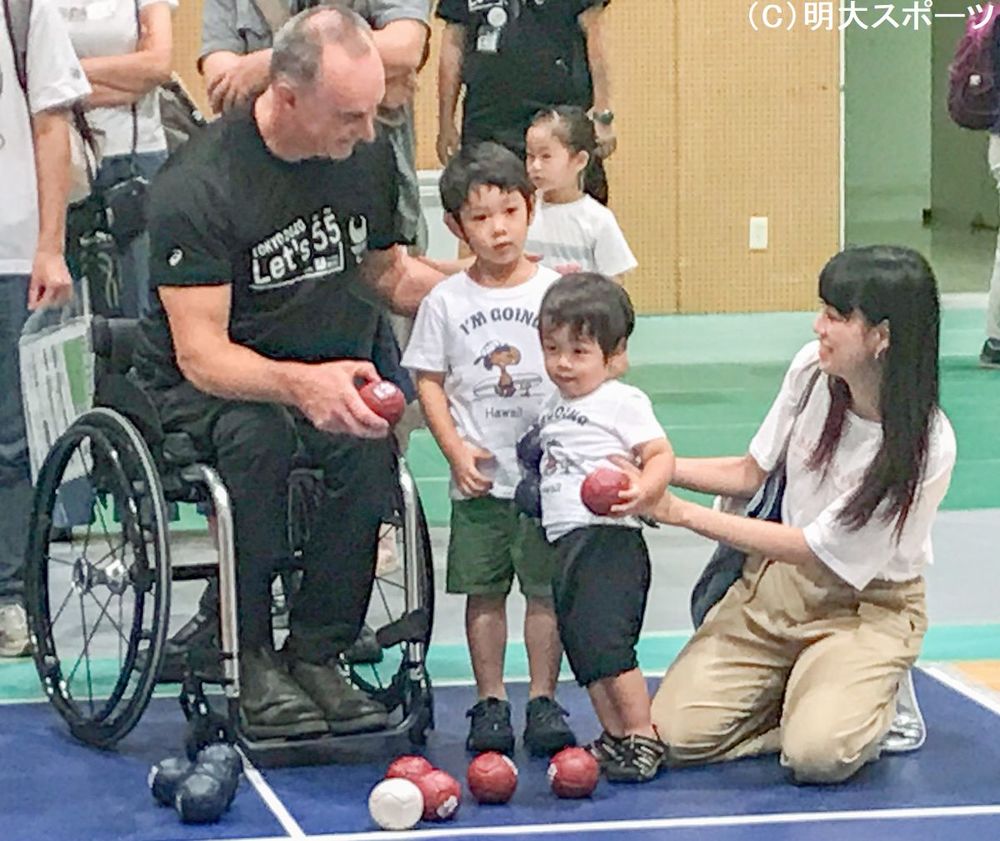 (写真:ボッチャを体験する国際パラリンピック委員会のケール副会長と親子)