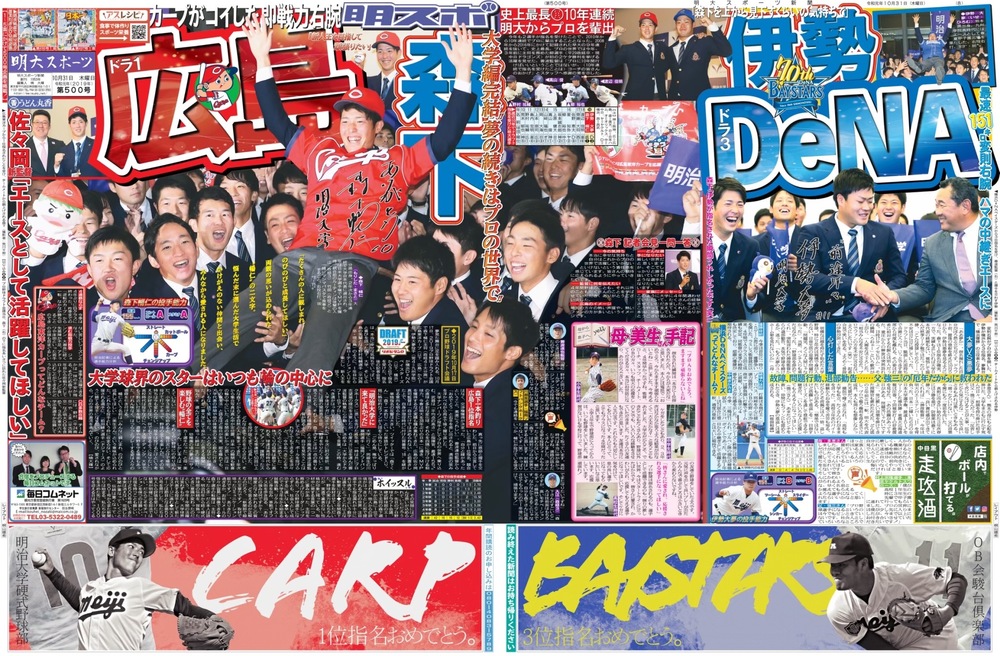 「明スポ」こと明大スポーツ新聞部は今年で創部67年と長い歴史があり、全国の数ある学生新聞の先駆けです。主な活動内容は、明治大学の体育会45部を取材し、新聞やWEBを通して〝明治の今〟を発信すること。有識者に取材に行くこともあり、昨年はオリエンタルラジオ・藤森慎吾さんやパンサー・向井慧さん、ユーチューバー・おるたなChannelさんをはじめとする多くの有名人の方々にご協力いただきました。