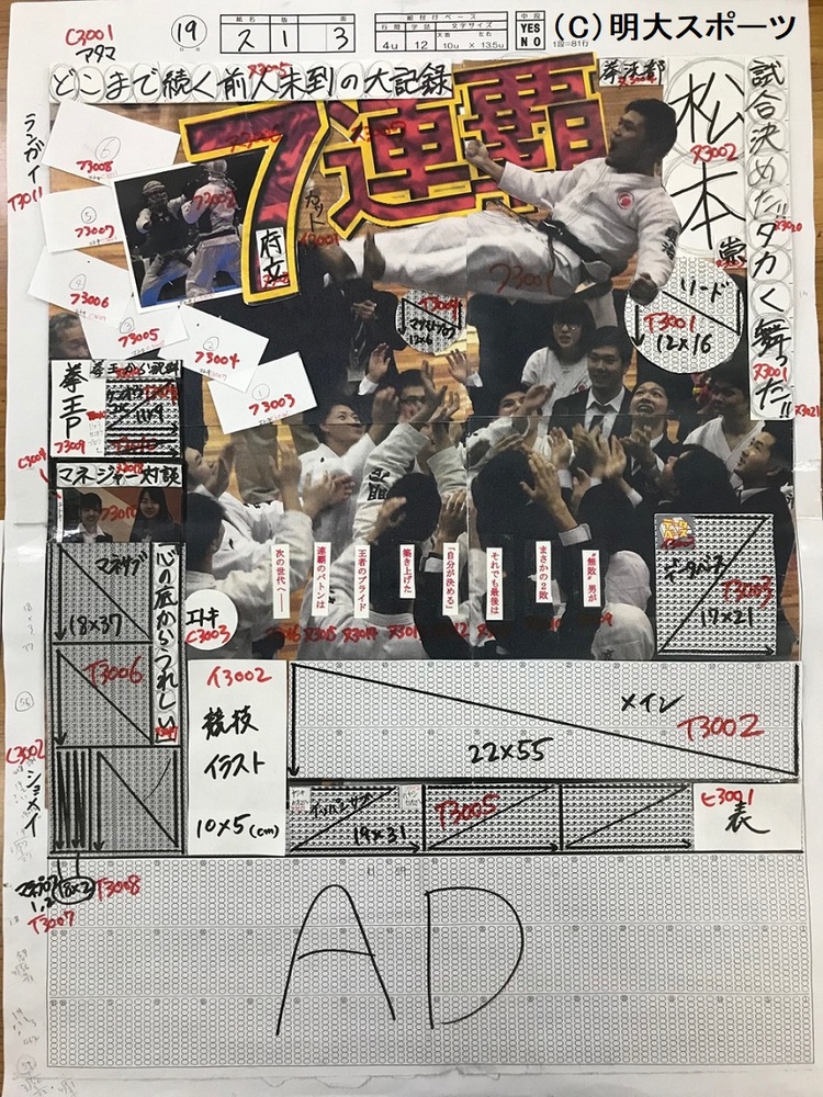 二つ目は記事の大きさ、写真の大きさを決めるレイアウトです。大会の結果の重要度、ネタの多さを考慮して、どこの面にどの記事を置くか、写真をどの程度の大きさにするかを決定します。