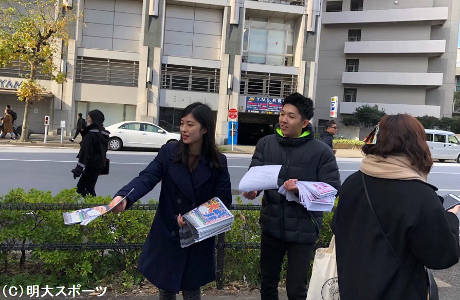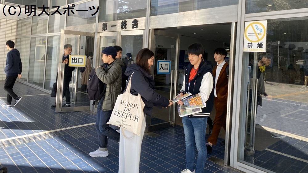 いかがでしょうか。自分たちが作ったものが読者にわたる瞬間は、何事にも代えられない感情に満たされます。また配布を通して明スポの注目度の高さ、先輩方が積み上げてきた伝統の重みを肌で感じることができます。皆さんと熱い配布ができる日を楽しみにしています!