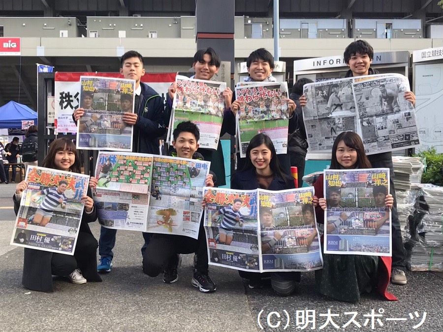 毎年12月の第1日曜日に開催されるラグビー明早戦。その特集号を試合前に秩父宮ラグビー場で配布します。世間からも大きな注目を浴びる明早戦。試合前から席取りのために並ぶ観客の方々からは「明スポちょうだい!」と新聞を求める声があちこちから! 満開の神宮いちょう並木の下、次々にはけていく新聞に興奮が抑えきれません!