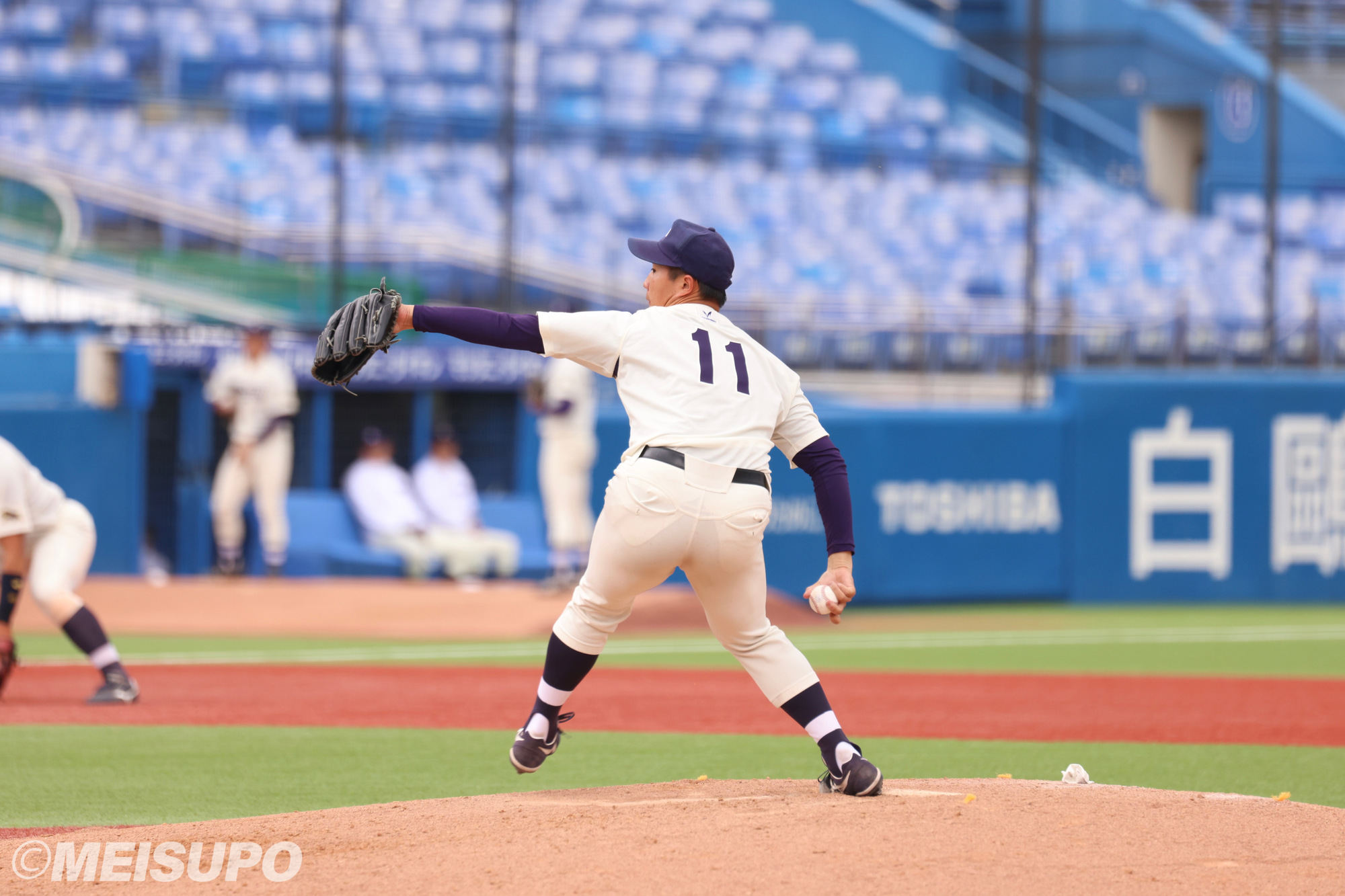 6回2失点と好投した村田 今季慶大が守った135イニングの内、94イニングを外丸と第2先発の谷村の2人が占めた投手陣の陣容を考えれば、苦しいのがどちらかは明白だった。6回表、1死から連続四球で一、二塁の好機を作ると上田希由翔主将(国際4=愛産大三河)の右前適時打で反撃開始。続く7回表は瀨千皓外野手(営2=天理)の二塁打から直井宏路外野手(商3=桐光学園)が二塁手の頭上を越える適時打を放ち、代走・榊原七斗外野手(情コミ1=報徳学園)が生還した。「自分の前の2打席を見て、狙い球を整理して打席に入ることができた」(直井)。この時点で慶大はエースの外丸を降板させており、勝ち筋が見え始めた明大サイドは意気揚がる。同点直後の7回裏からは蒔田稔投手(商4=九州学院)がリリーフ。「今季は球速の部分でつまずいてしまった」(蒔田)と、シーズン序盤はやや不安定な投球を見せていたが、同時に不調を理解した上での〝大人の投球〟が光った。カットボール、チェンジアップなど変化球を丁寧にコースに投げ分ける姿は昨年度にはなく、これに加え秋に球速が戻ってくれば、圧倒的な成績を残すことができるだろう。蒔田が3回を1安打無失点に抑え、迎えた10回表。3番手・谷村(慶大)を捉えた。1死一塁から途中出場の榊原がバスターを決め、好機を広げると、続く小島大河捕手(政経2=東海大相模)の値千金3点本塁打で勝ち越した。「打ったのはカーブ。1点を取りに行く打撃を意識した」(小島)。勝ち越した明大は蒔田がその裏を締め、2勝1敗1分で粘る慶大を振り切った。思えば今季、正捕手の不在が優勝候補の大本命とされる今季のチーム唯一の不安だった。抜群のインサイドワークで投手陣の信頼を集めた昨年度正捕手の蓑尾海斗選手(令5文卒・現Honda熊本)が抜けた穴。リーグ戦出場経験のある横山陽樹捕手(情コミ3=作新学院)らが故障で出遅れる中、弱冠19歳の小島は戦力ダウンを感じさせない活躍を見せ、ベストナインにも選出された。「試合になれば学年は関係ない。自分が引っ張っていくつもりだった」(小島)。異次元の勝負強さと積極性を持つ小島が3連覇の偉業達成に一役買ったことは間違いない。