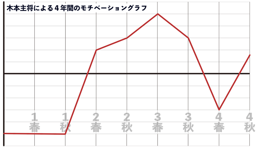 「いやもうこの辺ですね。1年生の頃は。出られると本当に思っていなくて、何気なく授業に行って、同級生と適当に練習に出てみたいな感じでした(笑)。1年のときは何もなくて(横ばい)」