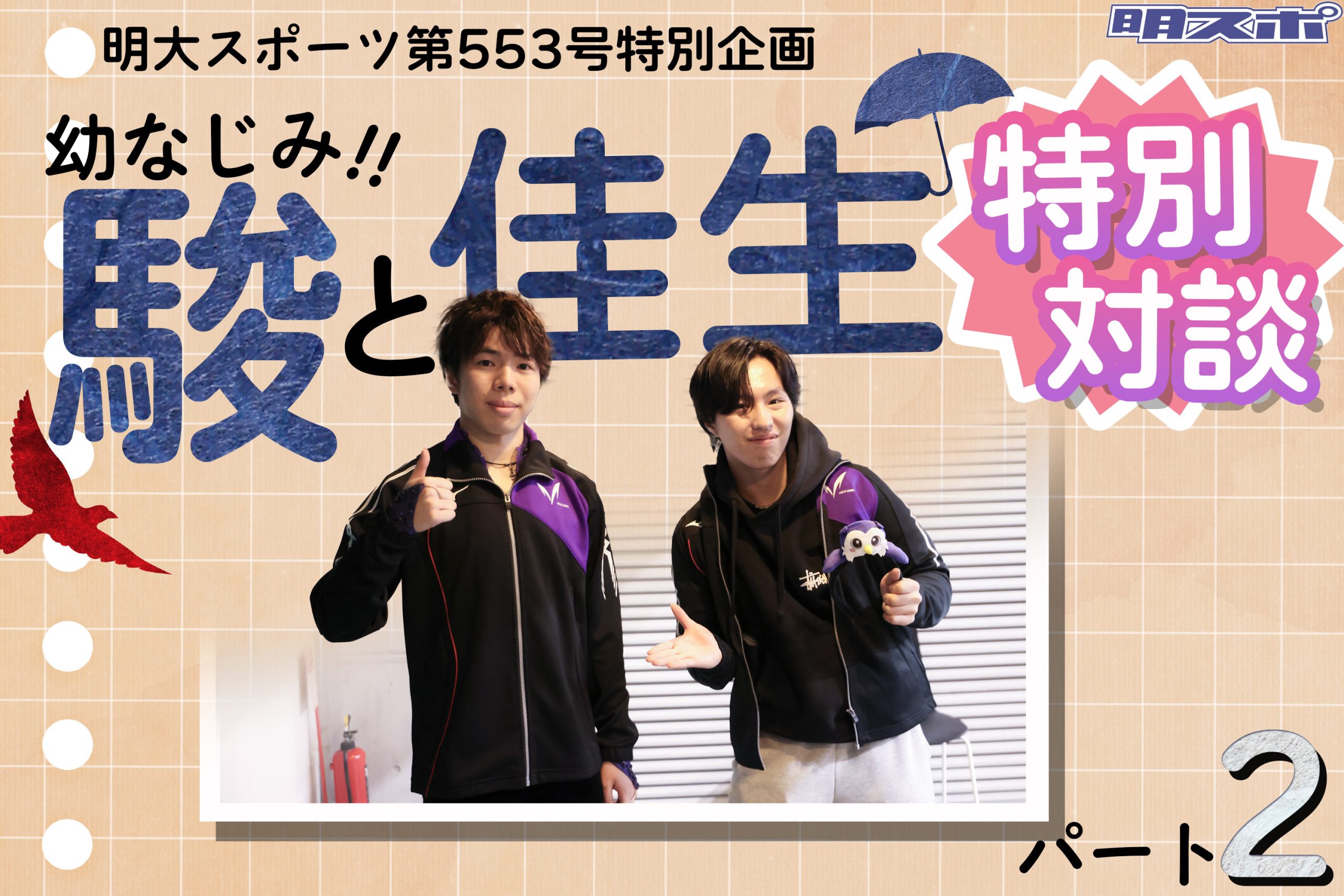 ミラノ・コルティナダンペッツォ冬季五輪(ミラノ五輪)を特集した明大スポーツ第553号。フィギュアスケートからは、ミラノ五輪出場が決まった佐藤駿選手(政経4=埼玉栄)と三浦佳生選手(政経2=目黒日大)を取り上げ、2人の対談を掲載した。五輪を懸けた全日本選手権(全日本)の振り返りをはじめ、2人の出会いや普段の関係性などについてお話を伺った。本記事では、紙面に載せ切れなかったインタビューを拡大版として掲載する。